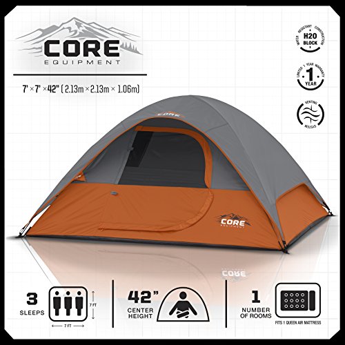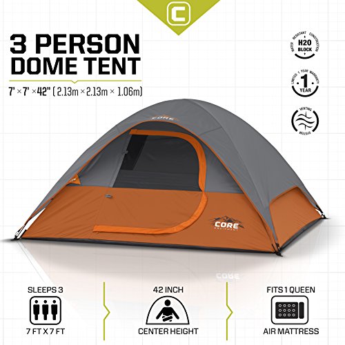 Studio : Elevate LLC Publisher : Elevate LLC Product Description Explore the outdoors with the latest in tent technology from CORE Equipment! The CORE 3 Person Dome Tent 7' x 7' features Core H20 Block Technology- water repellent fabrics with active bead technology for faster water runoff paired with sealed seams and rain-resistant door/window seals. The fully-taped rain fly is removable in warmer weather to expose panoramic mesh windows and ceiling. The advanced venting system uses the adjustable air intake vent designed to draw in cool air from the ground while the mesh ceiling allows hot air to escape keeping you comfortable all season. This three person dome tent also features zippered privacy panels on doors and windows and keeps your gear organized with the included gear loft with lantern hook and organizer pockets. 0