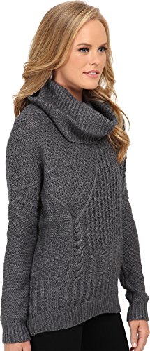 Body-hugging fit for extra warmth. Cable knit. Ribbed and oversized collar. Uneven hem. Dress closure. 33% viscose, 23% nylon, 20% lamb wool, 20% cotton, 4% cashmere. Hand wash cold, reshape and dry flat. Made in the U.S.A. and Imported.