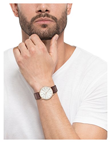 Round watch in polished rose gold tone featuring white textured dial with date window and slim stick hands/indices