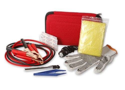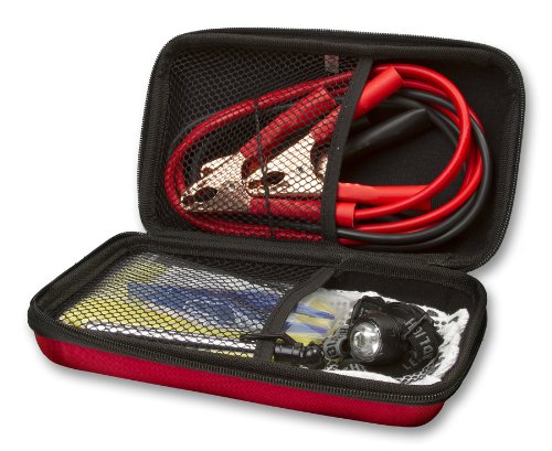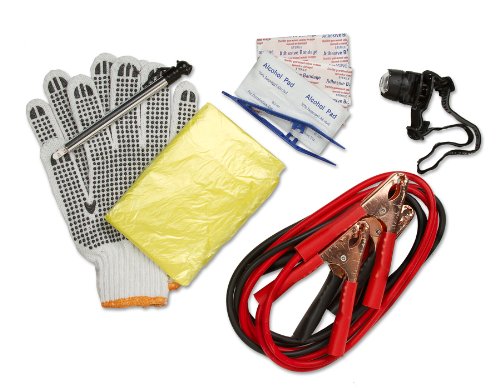 The roadside kit is a complete kit to assist you in the event of a roadside emergency. The 16 piece set includes jumper cables, an LED headlamp/clip light, self-adhesive bandages, rain poncho and more. The compact, portable storage case fits in the corner of your trunk or under your seat. Batteries included with the headlamp. Please read manual carefully for your own safety while operating the jumper cables.