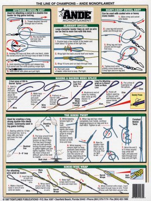 Studio : Unique Cell Distributors LLC Publisher : Unique Cell Distributors LLC Binding : Sports Product Description The Tightline Publications Knot Tying Chart comes complete with all of the most important fishing knots. Using the correct knot can be the difference between the one that got away and the catch of the day. 0