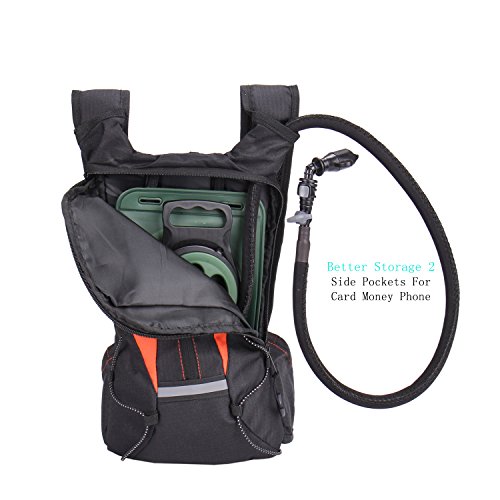 MULTIPLE STORAGE COMPARTMENT: This tactical hydration backpack has multiple pockets that give you all the space you need to store your various necessities.2 main pocket and 2 small pocket each side. Whether you go to travel, camping, hiking , the differently sized pockets will suit all your storage needs perfectly you need.