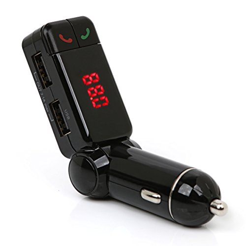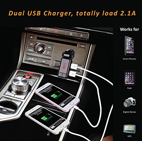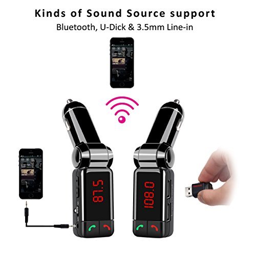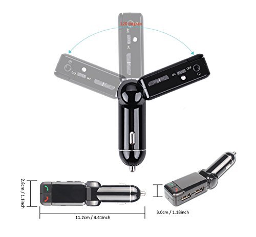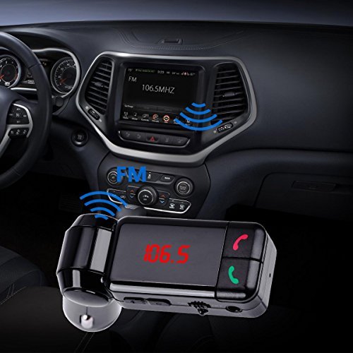 PRODUCT MULITIFUNCTIONAL DESIGN: 120 Degree Adjustable Bluetooth FM Transmitter Enables Handsfree Calls, Listening to music, and it Can Support TF Card and Aux input, Charge your Device and Monitor the Voltage of Car Battery.