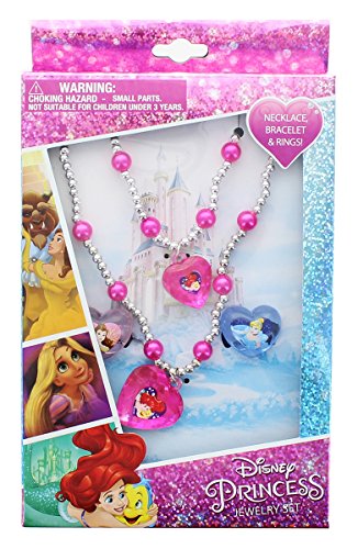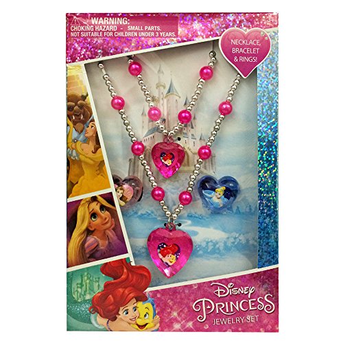 Disney Princess jeweler box set comes with a beautiful beaded necklace, bracelet and 2 rings. Perfect gift for any little fashionable princess. Featuring Princess Ariel, Cinderella, Belle, and Rapunzel.