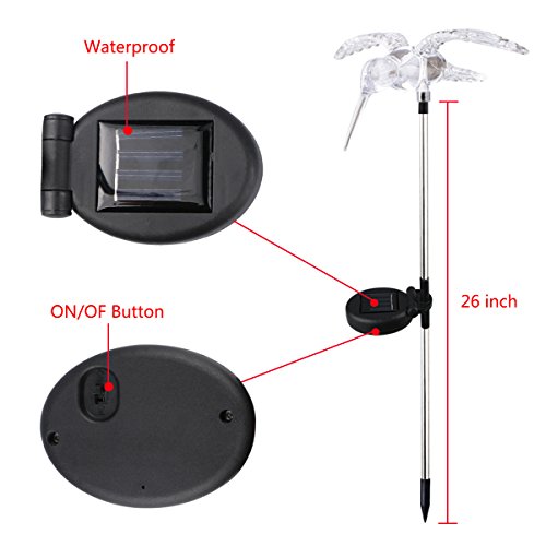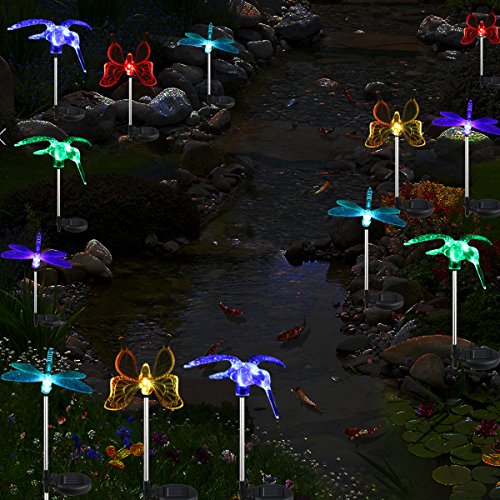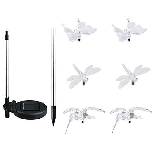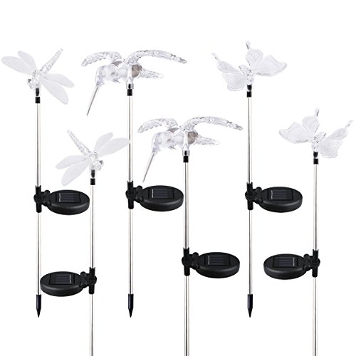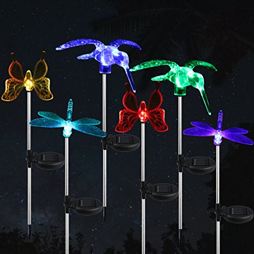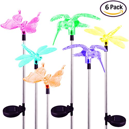 6 PACK: Solar powered LED lights with a hummingbird, butterfly and dragonfly shaped stake light with multi color-changing LED perfect for outdoor garden pathway lawn yard decoration