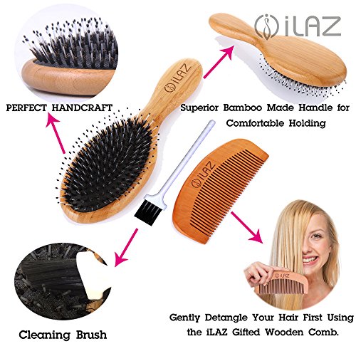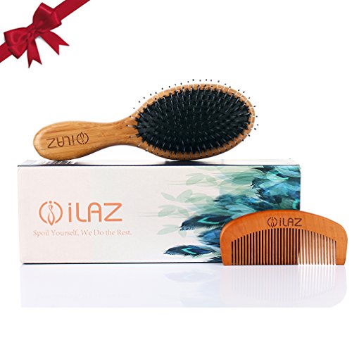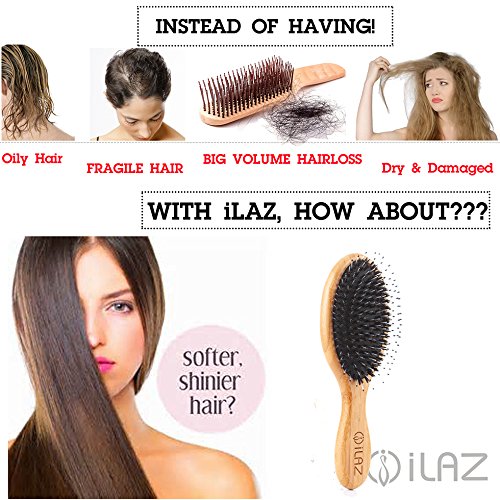 √The beauty of your hair depends on its health- iLaz Boar Bristles Hairbrush Gift Set is now offering you: Say Good Bye to Hair loss, to Oily, Fragile, Dry and Damaged Hair Permanently! (Including :A Natural Boar Bristles Hairbrush & A Wood Detangling Comb & A Cleaning Brush)