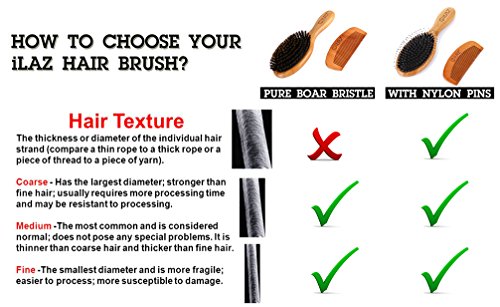 √ iLaz Boar Bristles Hairbrush is 100% made of natural sheared boar bristles and superior bamboo material. Mixed with the nylon pins in a perfect proportion, helps detangling hair and distribute the sebum better from root to tip.