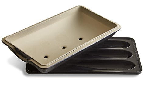 The ceramic baguette baker, which is made in France of Burgundy Clay, traps steam from the baking bread to create an environment similar to a steam-injected oven. The unit holds three, 13½-inch long by 2¼-inch wide, artisanal French baguettes. It is Dishwasher safe and comes with a 10 year warranty.