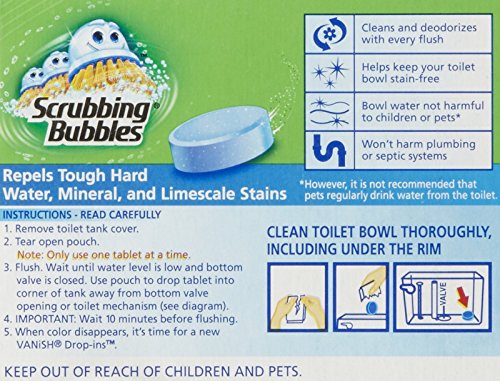 Studio : Vanish Publisher : Vanish Binding : Grocery Product Description Scrubbing® Bubbles Vanish® Toilet Drop-Ins™. SC Johnson. A Family Company. 1 blue tablet. Stain repel. Helps keep your toilet bowl stain-free. Repels tough hard water and limescale stains. 0