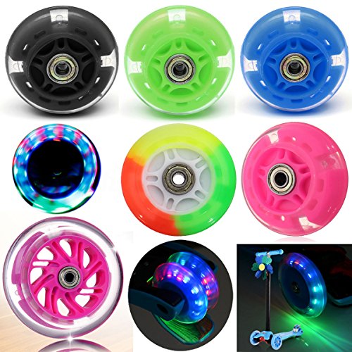 -. Brand : again -. EAN : 7597934580027 -. Feature : Color:Black,Pink,Colorful ,Blue,Green / Please note that slight color difference should be acceptable due to the light and screen. / LED FLASHING wheels guaranteed to fit the front of your Mini or Maxi Micro Scooter or other scooters taking 80mm diameter wheels! / These wheels are same diameter but 'tyres' are 5mm slimmer. The wheels have the same 'fit' so can be used safely. / High quality ABED-7 bearings and alloy spacer pre-fitted. -. IsAutographed : 0 -. IsMemorabilia : 0 -. Label : again -. Manufacturer : again -. MPN : again -. PartNumber : again -. ProductGroup : Sports -. ProductTypeName : OUTDOOR_RECREATION_PRODUCT -. Publisher : again -. Studio : again -. Title : Single LED Flash Light Up Wheel for Mini Micro Scooter with 2 ABED-7 Bearings (random)