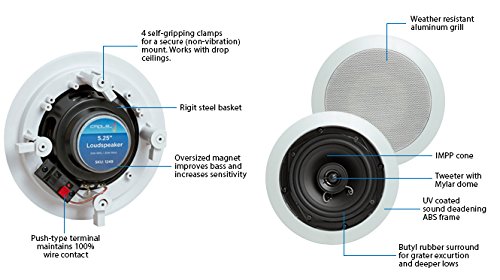 -. Feature : 4 self-gripping clamps for a secure (non-vibration)mount. Works with drop ceilings / Right steel basket. Oversized magnet improves bass and increases sensitivity. / Oversized magnet improves bass and increases sensitivity / Weather resistant aluminum grill / Butyl rubber surround for grater excursion and deeper lows