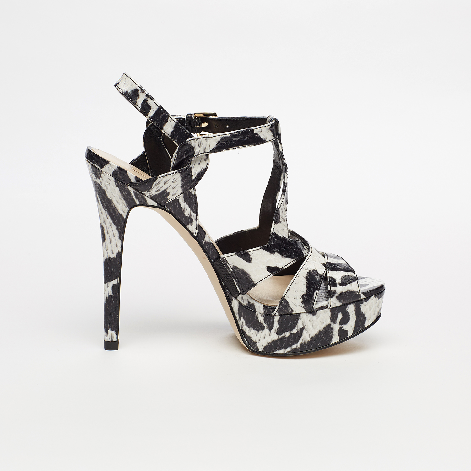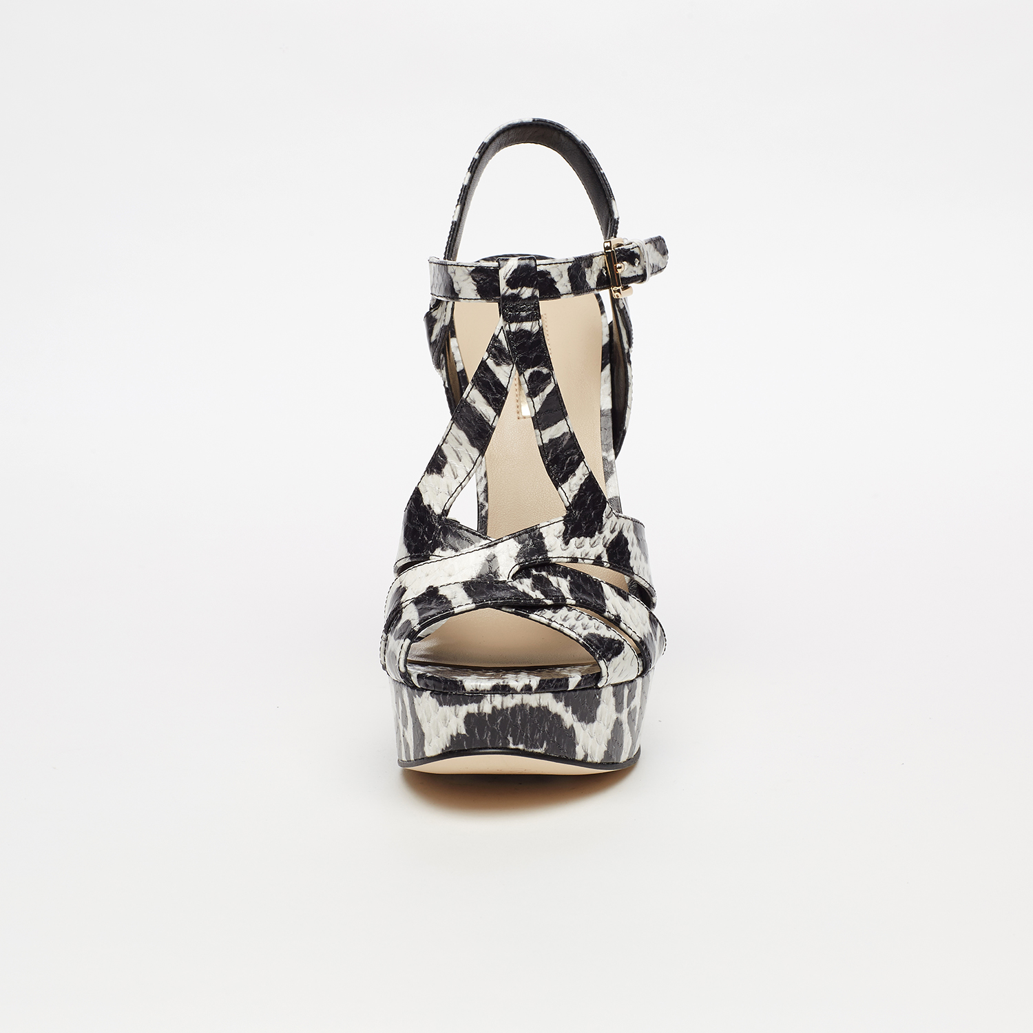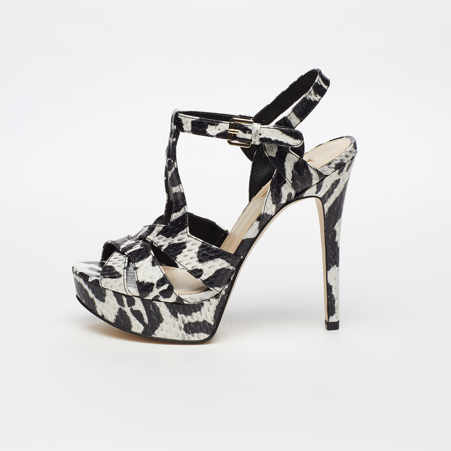 * 수입화 특성상 한치수 크게나온 디자인으로 기존 230의 경우 225사이즈로 주문하세요 * 모델명 : SG2A5A27 굽높이 : 13CM(앞3CM) 색상: 상세이미지 참조 소재: 합성가죽 제조국: 중국 * 멀티 크로스 스트랩 디자인이 돋보이는 샌들 * 볼드한 플랫폼 &; 스틸레토 힐 콤비 * 유니크한 텍스처의 Glam한 프린트 매칭 * 조절 가능한 골드 버클 앵클 스트랩