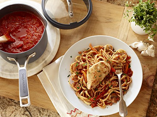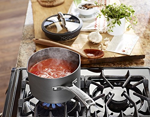 -. Feature : Multi-layer nonstick with etched fill marks / Glass lids with silicone rims / Hard-anodized aluminum construction with pour spouts / Oven safe to 450 / Full lifetime warranty
