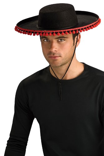 -. Brand : Rubie's -. Department : womens -. Feature : Black Durashape Felt Spanish Costume Hat with Red Pom Poms / Molded Hat with Adjustable chin strap, accented with red pom poms around brim / Std Size Adult (Approx. 22" inside diameter) -. ProductGroup : Apparel -. ProductTypeName : ADULT_COSTUME -. Title : ADULT Spanish Costume Hat (Pom poms are redder than appear in photo)