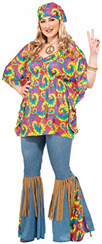 -. Binding : Apparel -. Brand : Forum Novelties -. Department : womens -. Feature : Hippie chick costume includes tie-dye blouse and bell bottom pants / Bell bot feature tie-dye insets and tan fringe / Plus size fits women with a 42 to 46-inch bust and 38 to 45-inch waist, size 18 to 22 / Necklace, head scarf, and other accessories sold separately / Made by forum novelties, a leader in costumes and novelty products for more than 30 years -. Genre : Decades -. IsAdultProduct : 0 -. Label : Forum Novelties Costumes -. Manufacturer : Forum Novelties Costumes -. PackageQuantity : 1 -. ProductGroup : Apparel -. ProductTypeName : ADULT_COSTUME -. Publisher : Forum Novelties Costumes -. Studio : Forum Novelties Costumes -. Title : Forum Novelties Women's Plus-Size Hippie Chick Plus Size Costume
