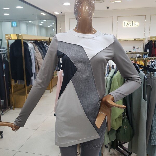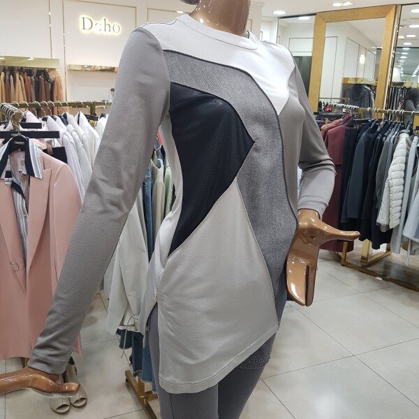 목선 라운드에 옆트임에 언발한 티셔츠 디자인입니다.