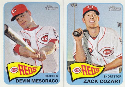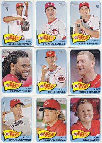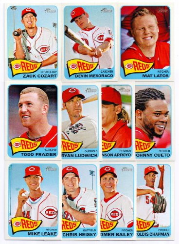 2014 Cincinnatti Reds Topps Heritage Baseball complete mint basic 11 card team set; it was never issued in factory form. Cards included are Aroldis Chapman, Homer Bailey, Chris Heisey, Johnny Cueto, Mike Leake, Todd Frazier, Ryan Ludwick, Bronson Arroyo, Mat Latos, Devin Mesoraco and Zack Cozart.