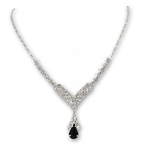 -. Binding : Jewelry -. Brand : JewelryStylist.com -. Color : Black -. Department : womens -. Feature : Sparkly Rhinestone V Necklace with Black Austrian Crystal Pear-shaped drop. / Necklace can be worn between 19-21"s with attached extension / Matching Rhinestone Earring are 1 3/4" long / Shipped in a black box or organza bag for easier gift giving -. ProductGroup : Jewelry -. ProductTypeName : FASHIONOTHER -. Title : Black and Rhinestone V drop Necklace & Earring Set - Black Prom Bridesmaid Jewelry