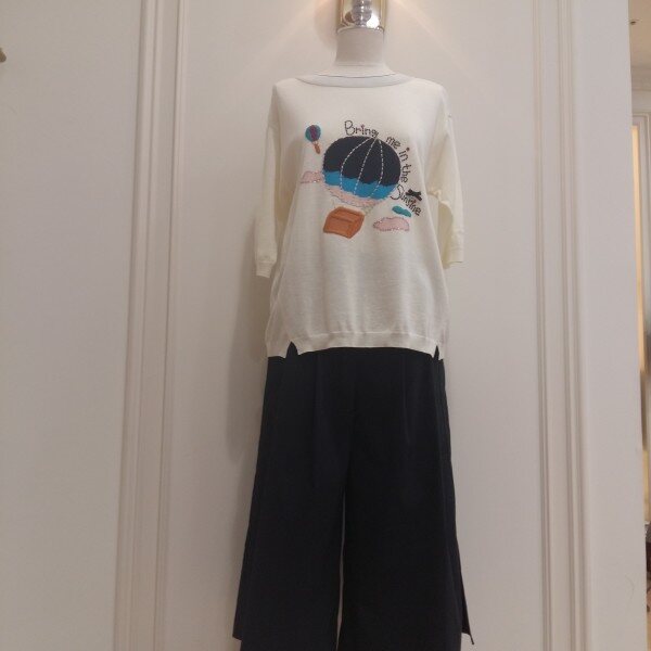 애드벌룬자카드에 핫피스와 자수로 장식을 한 귀여운풀오버.스커트나 반바지와 코디.