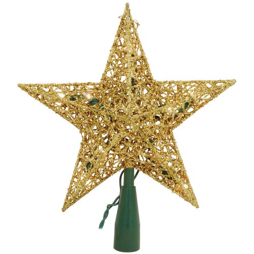 Bring a rich golden glow to your Christmas tree with this 10-light 9" gold wire treetop by Kurt Adler. Its classic 5-point star design has a glittery golden finish that is sure to add sparkle to your holiday decor. Each star has a 48" green lead wire, 12V 0.72W clear incandescent bulbs, 4 spare bulbs, and 1 fuse. For indoor use only.
