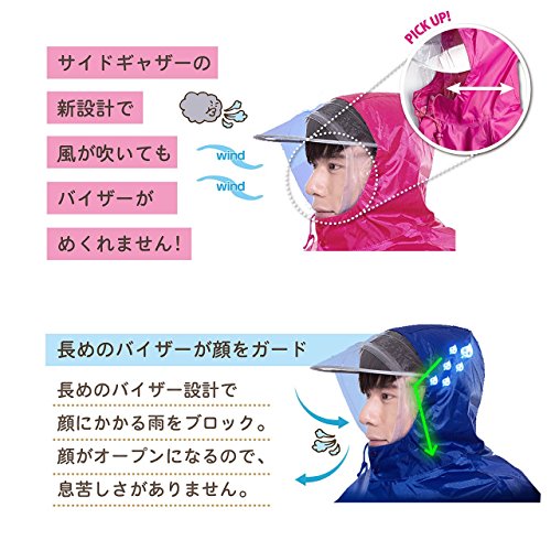 -. Feature : 袖長設計で前カゴの荷物も濡れない。従来のタイプより袖長にすることで自転車の前カゴまで余裕をもって覆えるようになりました。 / マジックテープで前袖を固定。前袖裏のマジックテープを前カゴにセットすれば強風でもめくり上がりません。 / サイドギャザーの新設計で風が吹いてもバイザーがめくれません。 / 長めのバイザーが顔をガード。眺めのバイザー設計で顔にかかる雨をブロック。顔がオープンになるので、息苦しさがありません。 / 反射シートで夜でも安全。袖の橋と背中に反射性の蛍光加工を施しているので夜間でも安全です。