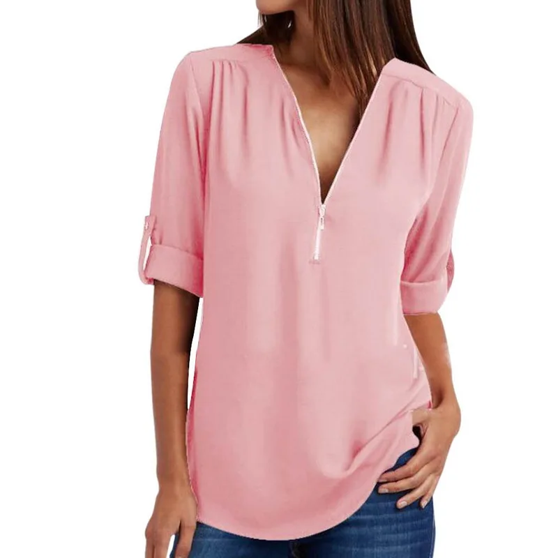 feature: Long Sleeve Casual V-neck Solid Zipper