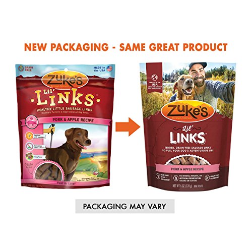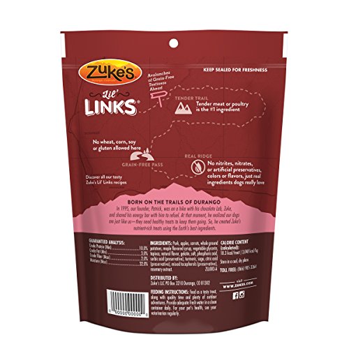 Entice your dog with the smell of fresh-cooked sausage when you offer up Zuke's Lil' Links Pork & Apple Recipe dog treats. Real pork is the first ingredient, and each bite features wholefood fruits and veggies and fresh savory herbs. Each meaty bite of these pork and apple dog treats delivers the tender moistness that keeps your dog coming back for more, and the mouthwatering taste is sure to have him licking his chops. We formulate this recipe with wholesome apples, carrots and potatoes rather than mystery meats, by-product meals, artificial colors, flavors or added animal fat, so you can feel good about the snacks you give your dog. Give him one of these Zuke's Lil' Links Pork & Apple Recipe dog treats as a reward for a long day of play, to encourage positive behavior in your dog or to teach him new tricks. The small makes it easy to select the right portion size for celebrating his accomplishments, so you can show your faithful friend just how important he is to you.Feature