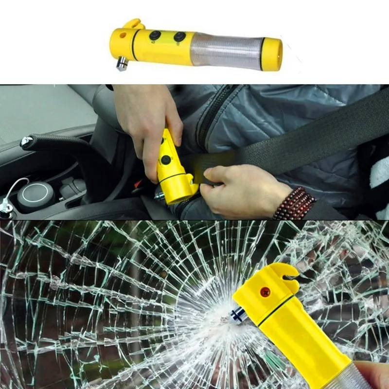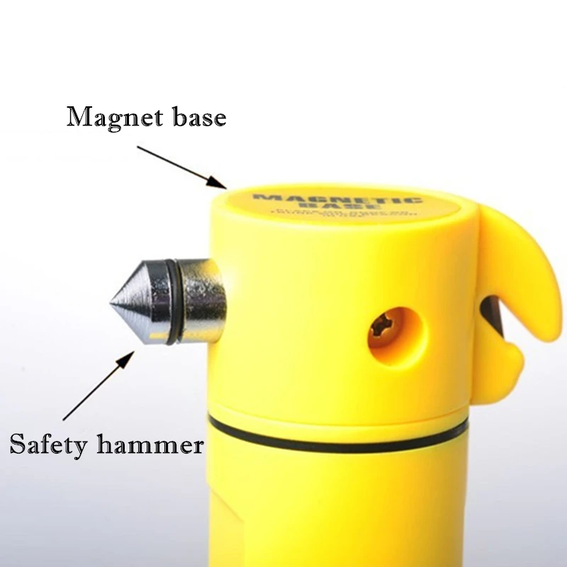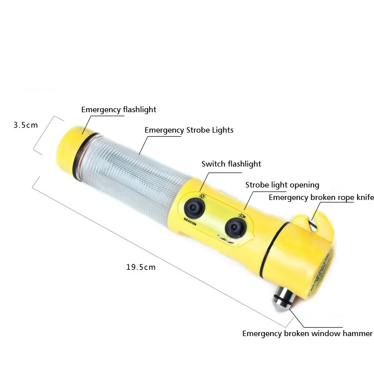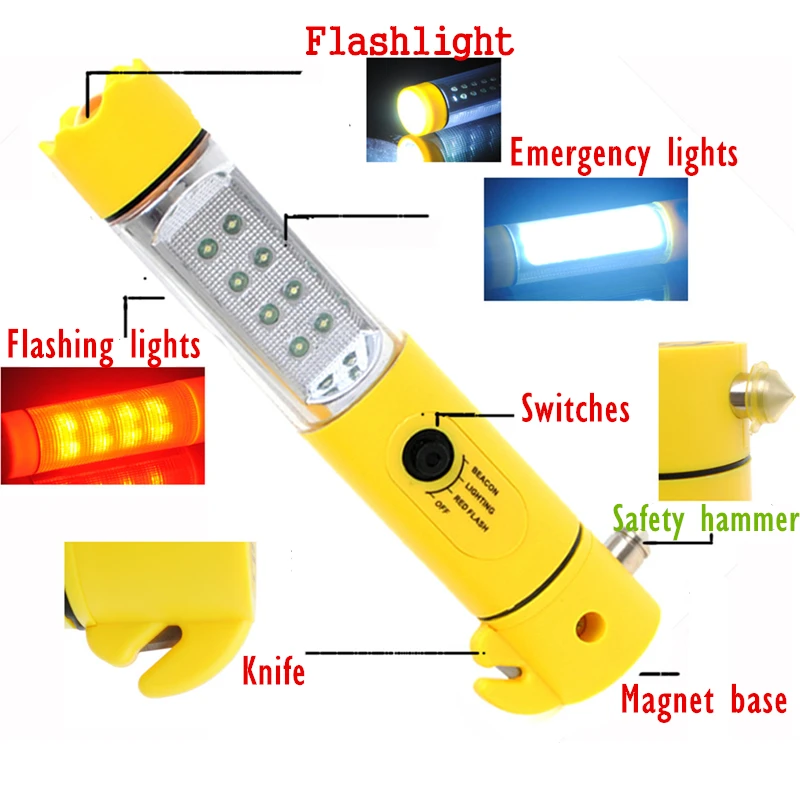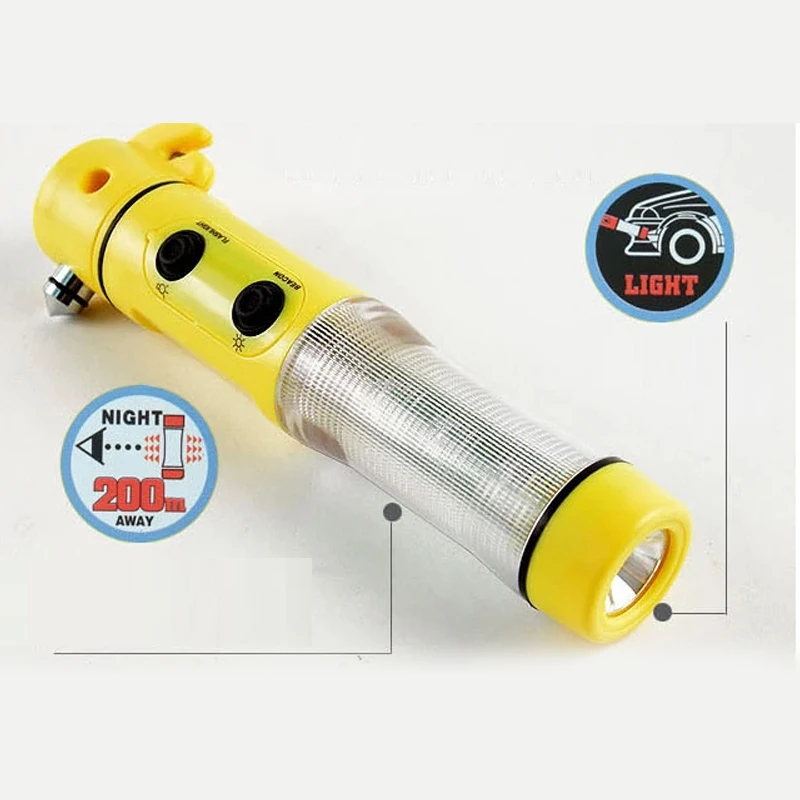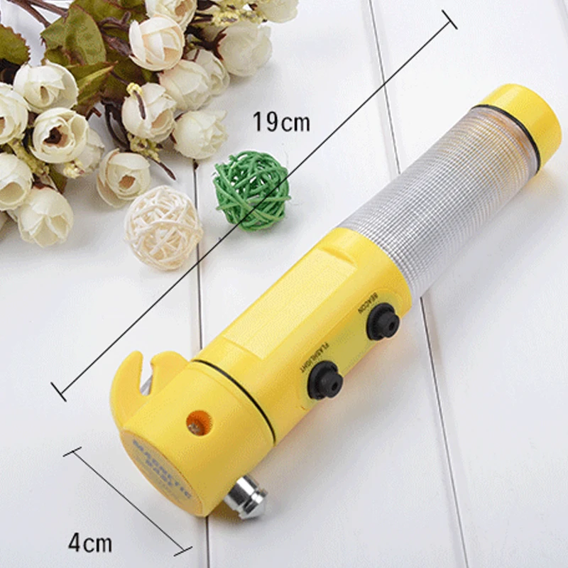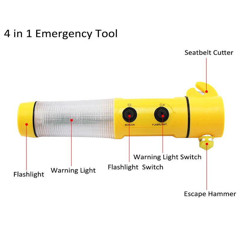 4 Functions: torch, Beacon light, belt cutter, emergency hammer