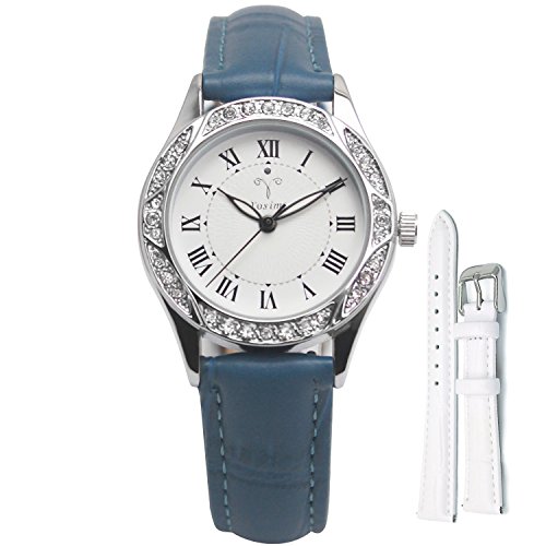 -. Feature : どんな服装にも合うシンプルなデザインで、様々なシチュエーションのコーディネートに合う。 / 上品な女性向けの腕時計です。文字盤の周りに宝石の飾りで,見た目が可愛くて、使用感も良いのでおすすめです。 / レザーベルトは質感や手触りは申し分ありません。ブルーとホワイト二つカラーのバンドがあって、自由に交換できます。 / ムーブメントは日本製で、時間が正確で、とても信頼性があります。 / 30メートル(3気圧防水)日常生活用防水(シャワーや水泳など禁止)