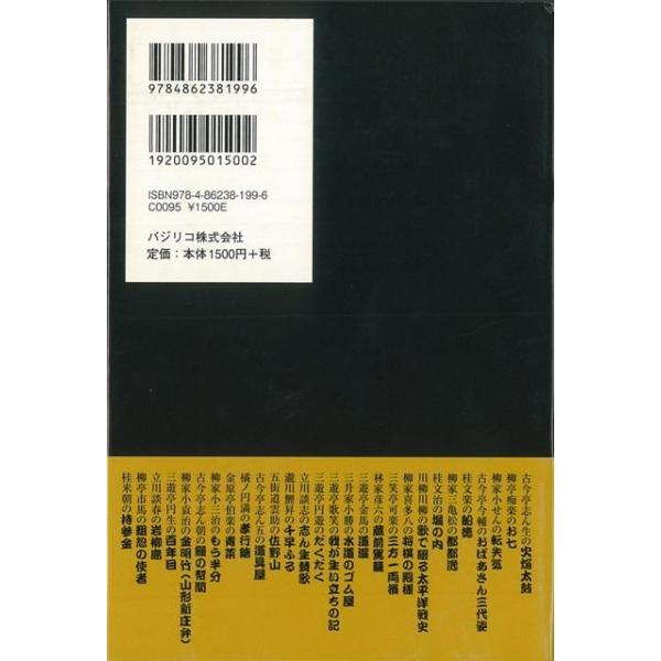 【商品説明】 定価(税込み):1,620円 値引き:10% OFF 落語に出会って50余年、ベテラン落語家が綴ったたまらなく好きな28人の噺家と噺のエピソード。古今亭志ん生の火焔太鼓/柳亭痴楽のお七/柳家小せんの転失気/古今亭今輔のおばあさん三代姿/桂文楽の船徳/柳家三亀松の都都逸/桂文治の堀の内/川柳川柳の歌で綴る太平洋戦史/柳家喜多八の将棋の殿様/三笑亭可楽の三方一両損、ほか。 バーゲンブック 新品 特価 格安 映画 演劇 古典芸能 歌 将棋 戦史 | |