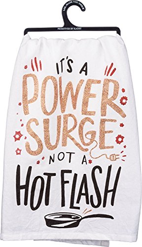 - Towel says: "It's a power surge not a hot flash" with glitter accents & a frying pan image