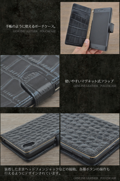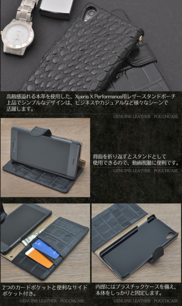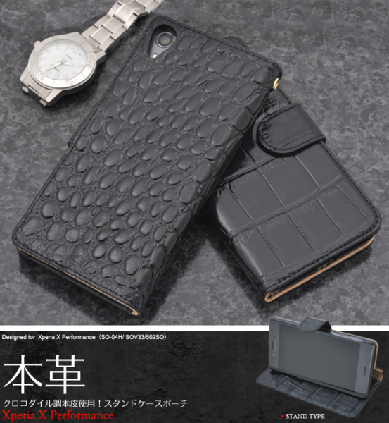 高級感溢れるクロコダイル調本革を使用した、Xperia X Performance用レザースタンドポーチケース。