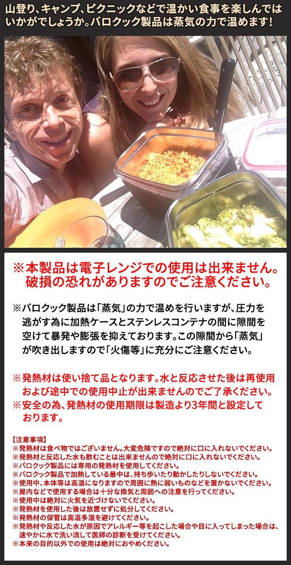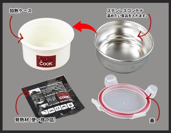 ステンレスコンテナと加熱ケースとの2重底構造になっており、加熱ケースに発熱材と少量の水を入れる事で反応して蒸気を発生させ、いつでもどこでも温かい食べ物が楽しめます。電気が使用できない場合でも使用可能なので、防災・緊急時・アウトドアなどにおすすめです。 |