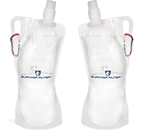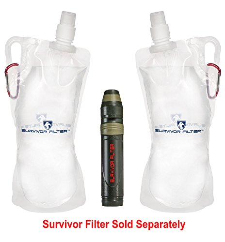Survivor Filter Collapsible Canteens (33oz) 2 Pack (2L Total) - with Extra Durable Carabiners and Handles. Squeeze Water through your Survivor Filter or Use as Water Bottles. Light and BPA Free.