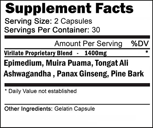 Studio : VH Nutrition Publisher : VH Nutrition Binding : Health and Beauty Product Description Virilate is a 100% natural, potent libido enhancing supplement for men. This male libido booster helps provide increased sexual desire, promotes blood flow and energy, and may help improve testosterone leading to a healthy libido. The pill format allows you to be ready within 4 hours of your desired sexual encounter. The creators of Virilate's powerful blend of ingredients spent months in the research and development of a product that could mimic the palpable results of other more expensive treatments with the cost effective, side effect free aspect of natural compounds. The resulting product was Virilate! We've chosen only the ingredients that show real world results in actual women in real time. With thousands of bottles sold, Virilate does what it claims. Often times men of all ages can get caught up in the hype of products that promise to deliver unbelievable results. With Virilate this is not the case. Used Daily it can boost energy levels, help modulate hormone balance, improve mood, and stimulate the desire for sex. If you are struggling with low libido try Virilate today! 0