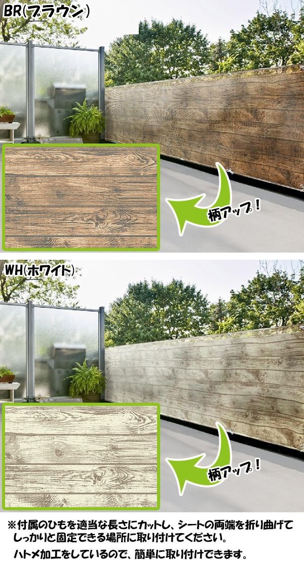 近年、お家のベランダやバルコニーは第2のリビングとして注目されています。「バルコニスト」という言葉も出てきており、自分流にアレンジをして、癒しやくつろぎの空間にする人が増えてきています。このシートを使えば、あっという間にイメージを変えることが出来ます。ハトメとひもが付いているので、取付けも簡単♪目隠しや日差しカットにも役立ちます。 |