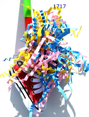 -. Feature : Great toy for small to medium size birds / A great shredding toy. / Will enjoy the colorful sneaker. / All bird safe materials. / Quick link for easy placement.