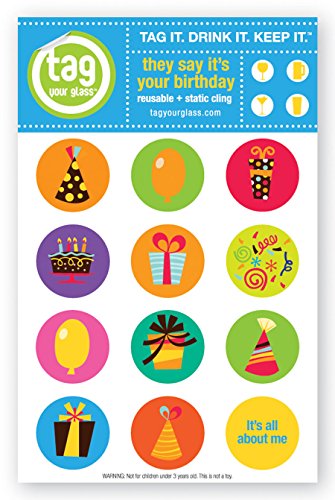 Happy Birthday - Wine, Champagne, Beer, Martini and Cocktail Glass Tags that work great on Stemless Glassware - 2 sets of 12 - charming, reusable, hip static cling drink markers that serve a purpose