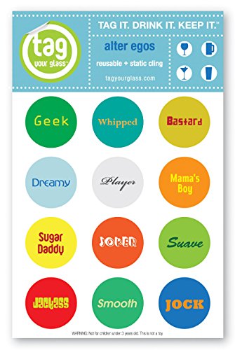 Alter Egos Men - Wine, Champagne, Beer, Martini and Cocktail Glass Tags that work great on Stemless Glassware - 2 sets of 12 - charming, reusable, hip static cling drink markers that serve a purpose