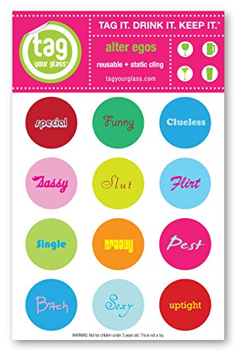 Alter Egos Women - Wine, Champagne, Beer, Martini and Cocktail Glass Tags that work great on Stemless Glassware - 2 sets of 12 - charming, reusable, hip static cling drink markers that serve a purpose