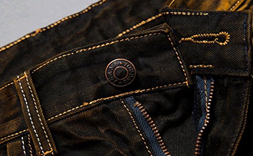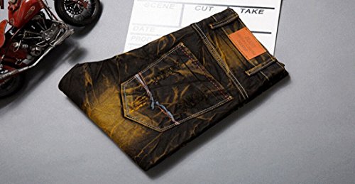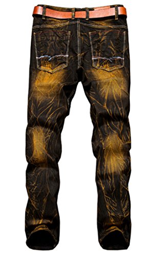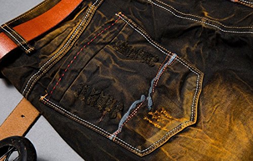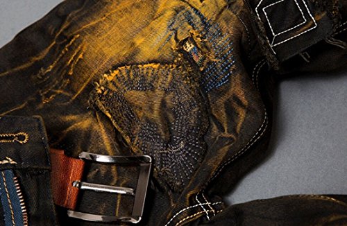 -. Binding : Apparel -. Brand : MR. R -. Color : Black Yellow -. Department : mens -. Feature : Zip fly with button / Inseam: 30"-32" / Basic 5 pockets / Straight leg, low rise / Note: belt not included. ASIAN SIZE -. ProductGroup : Apparel -. ProductTypeName : PANTS -. Title : MR. R Men's Stylish Ripped Slim Fit Jeans with Patches