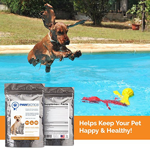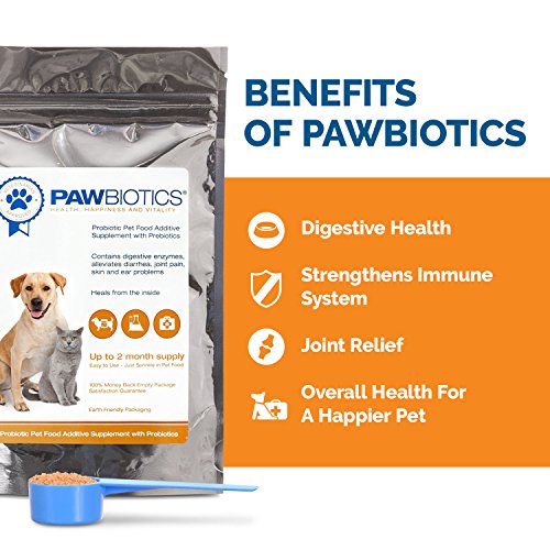 -. Feature : A SAFE AND NATURAL COMPLETE SOLUTION - With a proP.R.Ietary blend of 14 enzymes and two strains of probiotics (Bacillus coagulans and Saccharomyces boulardii), including prebiotics (from ground rice hulls), flax seed oil, and Vitamin E, our product is both safe and natural, with no artificial colors or flavors, fillers, preservatives, soy, sugar, or wheat, and it's made right here in the USA. / AN ESSENTIAL SUPPLEMENT FOR HEALTHY PETS - A government study reported that many "pet foods that claim to contain probiotics but contain very low numbers of viable organisms. Add Pawbiotics and be confident your furry friend is getting exactly what he needs? / CAN HELP WITH DIGESTION, AND MORE - Probiotics are known to help with intestinal problems and diarrhea, reduce gas, can support a healthy skin, less itching and scratching, alleviate hot spots, provide joint pain relief and overall greater vitality, and boost the immune system. / HIGH-STRENGTH YEAST-BASED FORMULATION - With one billion CFUs (Colony Forming Units) per scoop, this is a more potent product than many capsule-based probiotics - and it's a lot easier to administer to even the pickiest pooch or kitty thanks to its unique liver flavor derived from plant sources. / SUITABLE FOR DOGS AND CATS - GUARANTEED - Pawbiotics is great for all sizes and breeds of both cats and dogs, with one bag lasting up to two months (depending on the size of your pet). And if you and your pet aren't completely satisfied, we'll make things right with our manufacturer's 100% Satisfaction Guarantee, which means you can buy with confidence!