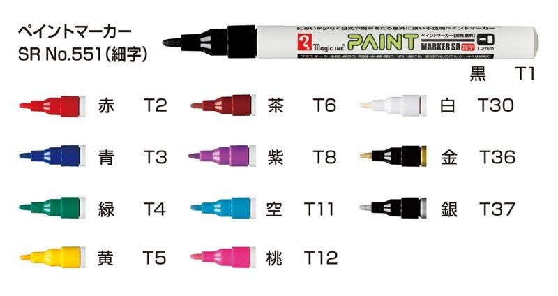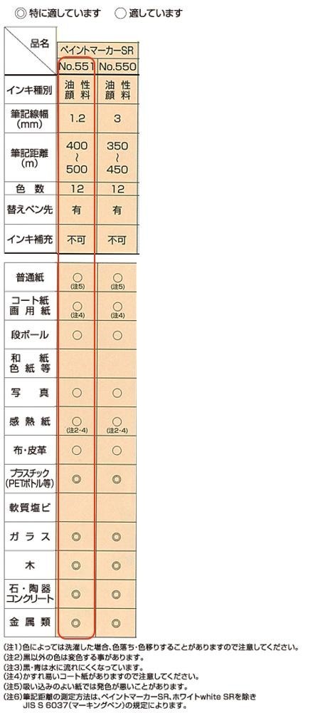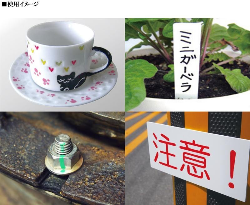 黒い面にも、白い面にも、透明のものにもくっきり鮮明に書けます。直射日光にさらされても退色の心配や、雨や水にぬれても流れたり消えたりする心配が少なく、屋外展示用に最適です。プラスチック、金属、ガラス、陶器、木、紙、革に書けます。 |