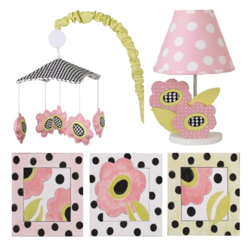 décor kit inlcudes wall art, musical mobile, and lamp