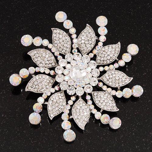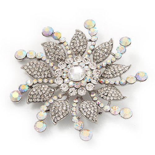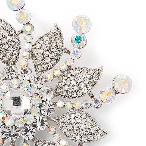 A dramatic statement, this fabulous flower brooch beautifully replicates the timeless glamour of 1940s Hollywood. Featuring a large flower shaped design literally encrusted with sparkling Swarovski crystals, you could just imagine one of the iconic Silver Screen Starlets wearing this brooch pinned on an extravagant gown. A beautiful 'piece' to wear when the occasion calls for a touch of sparkle, it looks divine pinned on a chic black sweater and coordinated with a pair of simple earrings for a dinner date or, for show stopping style, pin on the hip of a floor length dress for a black tie event. For the star in your life, this would also make an exquisite gift for the costume jewellery addict. Perfect for brides who adore sparkling vintage inspired wedding brooches, this would transform a simple gown into a couture masterpiece. With its star design, it would add a magical touch to a Winter wedding and also looks sensational pinned into a bouquet. It crafted in rhodium plated metal and measures about 8cm in diameter, fastens with a flag pin and revolver clasp.Feature