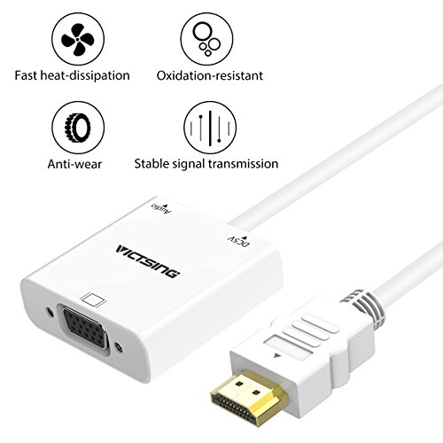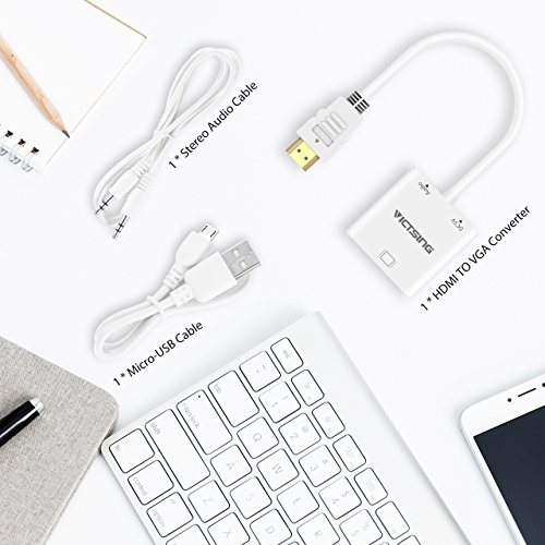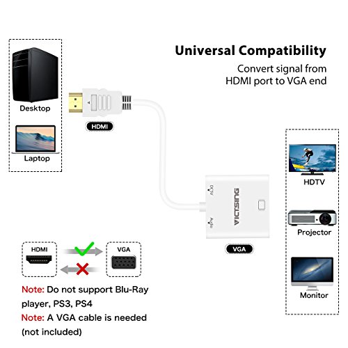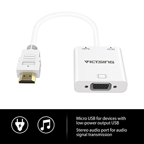HDMI TO VGA convertor with Micro USB and 3.5mm audio port Adapter Converter This Cable Gold Plated HDMI to VGA Adapter offers a convenient and reliable solution for connecting an HDMI source device to a monitor or projector with VGA port. It features a built-in active IC chip that improves compatibility and delivers sharp picture quality. Choose to "Mirror" your computer screen for a presentation on a projector or "Extend" your desktop to view more applications on a monitor. Support a full high definition resolution The HDMI to VGA Adapter allows for a connection to VGA monitors and projectors supporting a maximum 1080P resolution. Output both audio and video signal With VGA female port and 3.5mm audio port, you can connect to your new NoteBook, Laptop, HD DVD, HD DV without VGA interface to projector, Display, LCD, TV Monitor in old model with VGA interface only for big screen viewing, and output audio signal by speaker, headphone, amplifier and other device with 3.5mm audio port. Important Notes: 1. Please plug the micro USB power adaptor when HDMI port connects to low power device. 2. Do not support Blue-ray discs, PS3, PS4. 3 .HDMI to VGA only, cannot transport signal from VGA to HDMI. what's include: - 1x HDMI to VGA Adapter with Audio Micro USB - 1x Micro-USB Cable - 1x Stereo Audio Cable