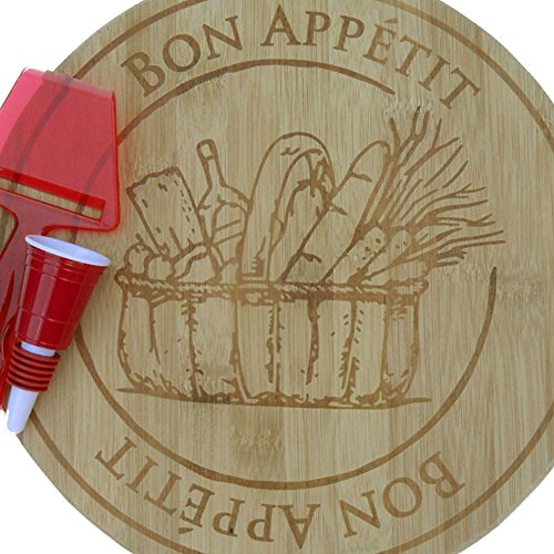 Enjoy one 11" laser etched bamboo cutting board, one 7" cheese plane in assorted colors and one useful wine stopper. The essential collection for a cheese and wine lover!