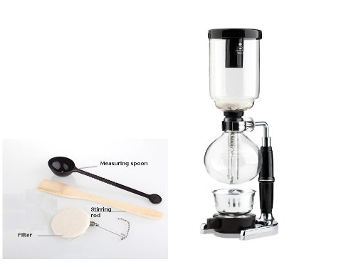 Design and composition of the vacuum coffee maker varies. The chamber material is borosilicate glass, metal, or plastic, and the filter can be either a glass rod or a screen made of metal, cloth, paper, or nylon.