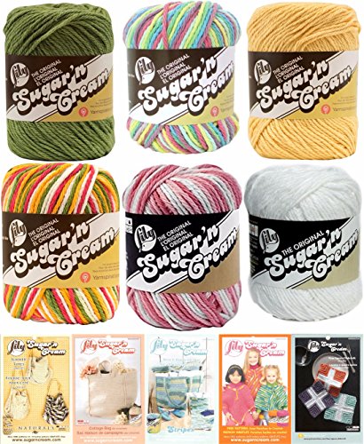 Price is for 6 assorted skeins of Lily Sugar'n Cream as shown. Popular for making durable dishcloths. Bundle includes Country Yellow, Strawberry, Mango,White, Sage Green and Candy Sprinkles. Includes 5 Lily Pattens.