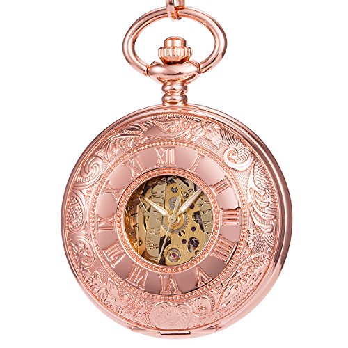 -. Feature : Special pink rose golden engraved case, Double hunter, Skeleton white dial with viewable golden movement. Classical pocket watch can bring your memory back to 18th, fashionable and attractive! * Fluorescent pointers, allow to read the times in dimly environment. / Comes with a high quality 6mm width Chain and nice gift BOX, A microfiber cloth for easy cleaning. Attractive Steampunk design, It's an eye-catcher at the suit, pants or dress of gentleman and lady! / 100% brand new with excellent workmanship, Precise golden mechanical movement. Please wind up the watch before every usage. *For safety, the front face is made of Acrylic instead of Glass. / No need to use battery, Twisting the top button on the spin, Tightening a walk for 24 hours, Please keep the watch away from magnet to avoid making the watch stop working. / PERFECT CHOICE - Perfect gift for your love and family or yourself, Best Valentine Gift, Superb Christmas Gift, Birthday Gift, Wedding Gift etc.